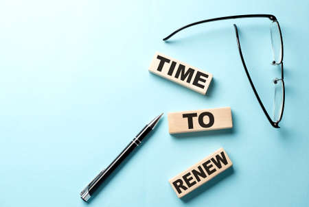 Text TIME TO RENEW concept on the wooden block on the blue background