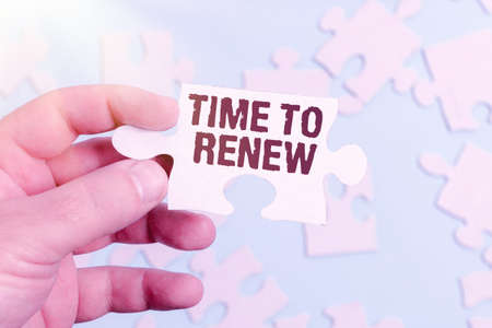 Sign displaying Time To Renew. Word Written on extending the period of time when something is valid Building An Unfinished White Jigsaw Pattern Puzzle With Missing Last Piece