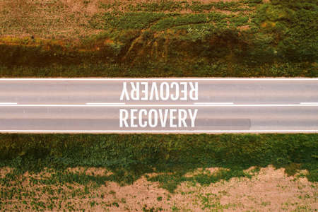 Recovery road concept, text on asphalt road from drone pov, directly above