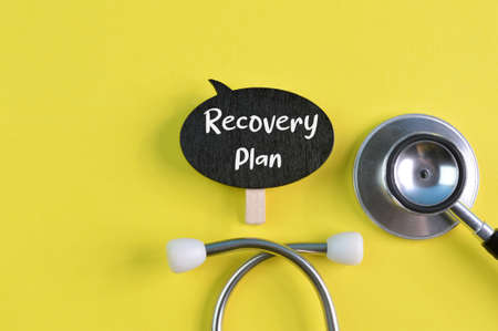 Stethoscope and wooden speech bubble with text RECOVERY PLAN
