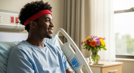 Young black man with curly hair and a red headband smiles faintly while recovering in a hospital bed, with colorful flowers on a bedside table, symbolizing hope and well being.