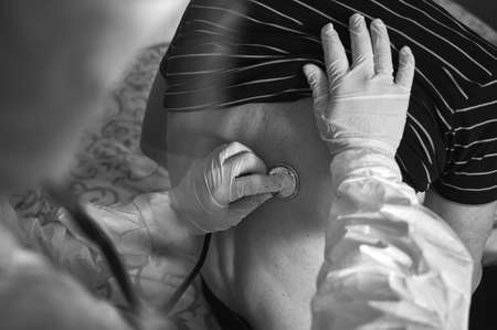Cropped close-up snapshot of doctors hand in PPE protective suit examining elderly male patient at home using phonendoscope, checking his back. Black and white image. COVID-19 concept