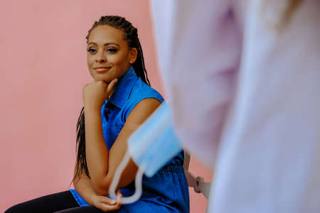 smiling black young adult woman with bandage plaster on arm sitting on chair after vaccination looking away at copy space