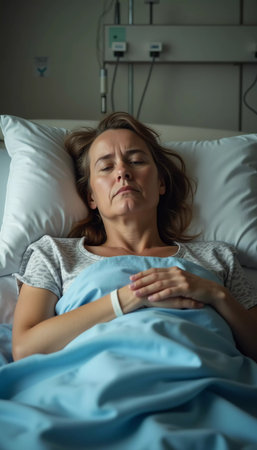 A woman lies in a hospital bed, eyes closed, deep in thought. Wrapped in a light blue blanket, she embodies resilience as she seeks comfort amid hardship, surrounded by warmth and care.