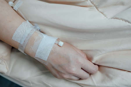 Hand with IV catheter in ward bed closeup. Aged patient undergo clinic treatment. Unrecognized senior person arm with intravenous therapy lying in operating room. Healthcare medical system concept.