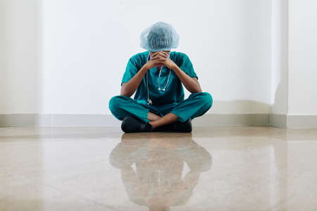Crying stressed and tired medical nurse sitting on floor of hospital hall after long day of work