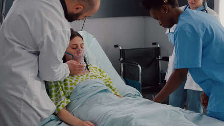 Clinical team monitoring sick woman putting oxigen mask analyzing respiratory sickness during coronavirus pandemic in hospital ward. Black nurse checking heart puls using medical oximeter