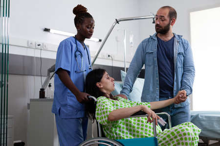 Pregnant woman in wheelchair getting assistance from nurse and husband while preparing for childbirth in maternity room at clinic. Medical assistant helping couple expecting baby