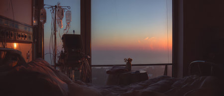A peaceful sunrise fills a hospital room with warm hues symbolizing hope and new beginnings as the New Year dawns.