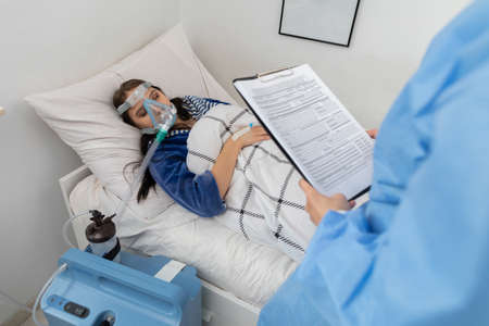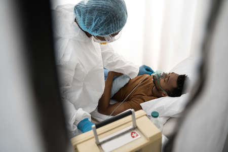 Top View of young man breathing on ventilator or oxygen concentrator mask at hospital due coronavirus covid-19 dyspnea or shortness of breath - Concept of covid viral infection millennial people.