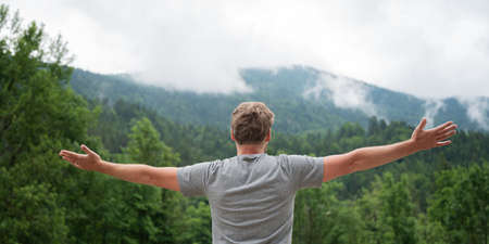 View from behind of a young man standing in beautiful green nature with his arms spread widely, enjoying life and abundance.