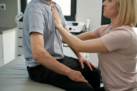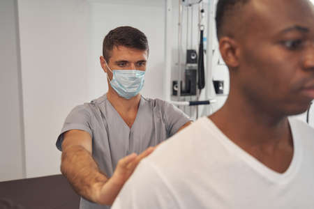 Experienced doctor examining spine of young man