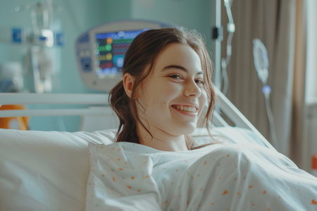 A cheerful female patient sits comfortably in a hospital bed, radiating positivity and hope during her recovery. The warm atmosphere highlights the caring healthcare environment.