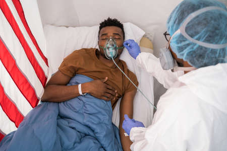 African american male patient lying on hospital bed wearing oxygen mask ventilator. medicine, health and healthcare services during coronavirus covid 19 pandemic.