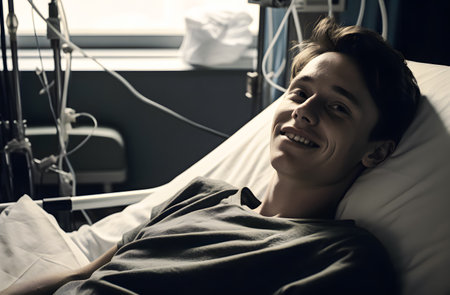 Portrait of a cheerful Polish man in a hospital bed, representing recovery, care, diversity, and positive healthcare experience.