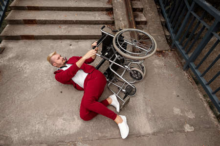 On the ground near the stairs lies a disabled man near the wheelchair. The concept of a wheelchair, disabled person, full life, paralyzed, disabled person