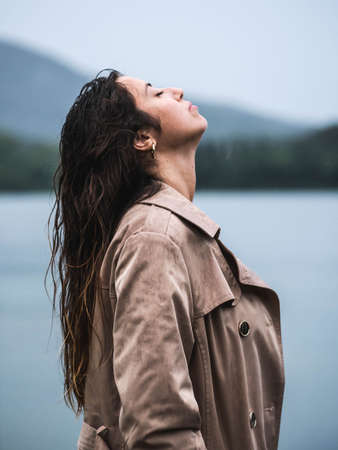 Young woman standing alone on footbridge and staring at lake. Mist over water. Foggy air. Chilly morning. Back view.