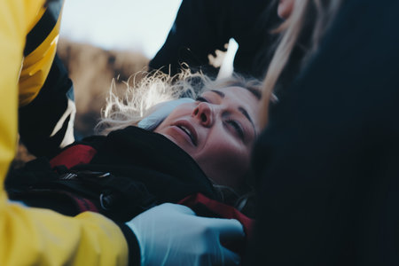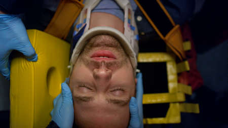 Closeup EMS paramedics hands in gloves rescuing patient in emergency car. Top view doctors providing medical help to victim. Injured man lying on stretchers. Medicine and health concept