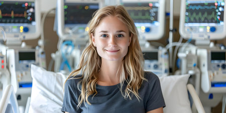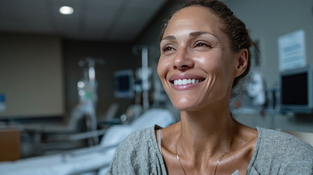 A smiling woman in a hospital setting showcases her positivity and hope following a recovery experience. Her expression reflects joy and relief amidst a healing environment.