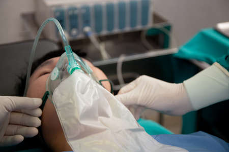 Closeup hands of doctor and assistant holding oxygen mask with patient emergency in the operation room at hospital, surgeon healing and surgery, problem of breathing, instruments medical and health.