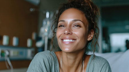 A joyful woman with curly hair smiles brightly in a hospital room, radiating warmth and resilience. This image captures the spirit of positivity and hope in challenging times.
