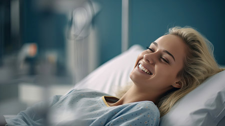A female patient lying satisfied smiling at modern hospital patient bed. health medical. Generative Ai