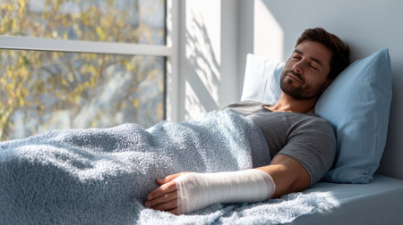 Broken arm supported in orthopedic splint, man resting on a pillow in a recovery room
