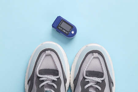 health monitoring. Healthy lifestyle concept. Sports shoes with pulse oximeter on a blue background. top view
