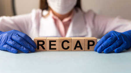 the concept of the word summarize on cubes on a medical background, doctor holding word recap