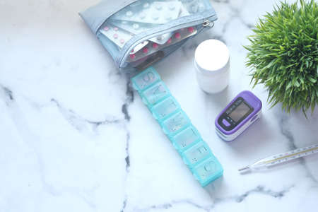 pulse oximeter and medical pills on table with copy space