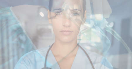 Double exposure of portrait of young female caucasian doctor and patient wearing oxygen mask. Copy space, emergency assistance, public safety answering point, universal emergency number.