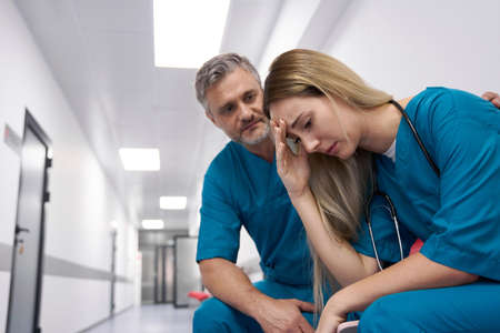Male doctor in corridor comforting sad female doctor