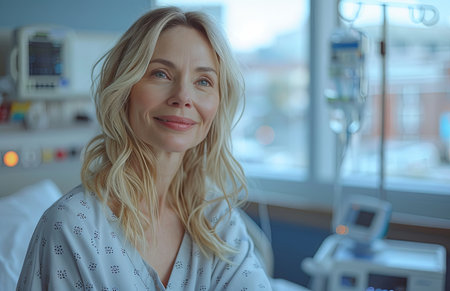 In a vibrant hospital room, a blonde female patient stands, wearing hospital attire, smiling brightly