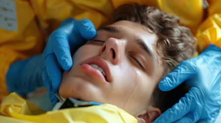 A person is receiving first aid for poisoning in a clinical setting, emphasizing urgent care