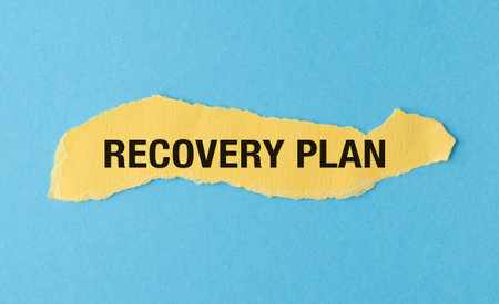A hand holding a piece of paper with the word Recovery Plan written on it. The paper is folded in half