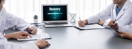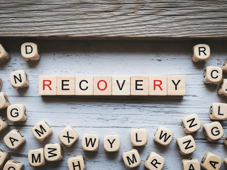 Stethoscope beside wooden letters spelling recovery, symbolizing healing, health care, and medical rehabilitation.