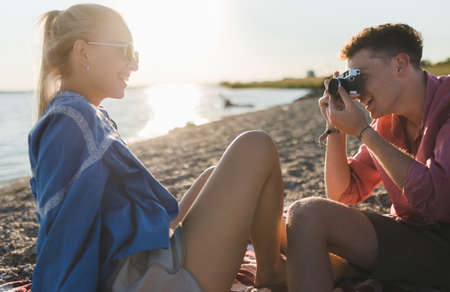 Young boy taking photo of his beautiful girlfriend at beach during sunset.