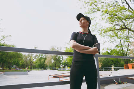 Young athletic beautiful girl in black uniform, cap with headphones listening music, standing keeping hands folded before or after running, training in city park outdoors. Fitness, healthy lifestyle
