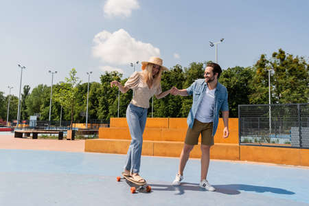 Cheerful couple riding longboard in skate park