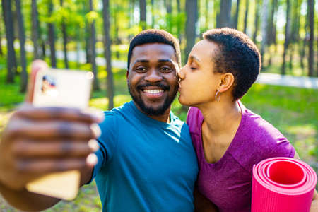 latin american couple ready to yoga time outdoors pink and blue look taking self portrait on modern smartphone