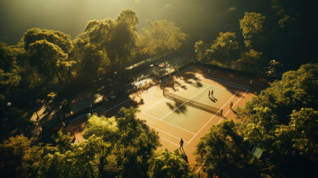 An aerial shot captures male tennis players engaged in a game on a court bathed in sunlight, encased in a verdant forest setting.