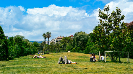 Barcelona, Spain - May 30, 2016: People taking a rest on the grass at the Parc de la Ciutadella in Barcelona, Spain. This is the main public park in the city