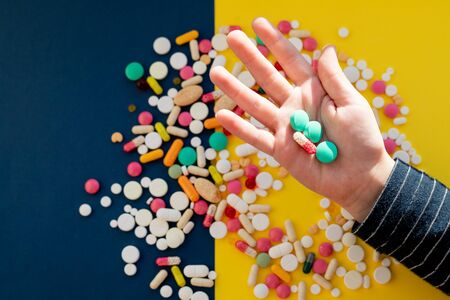 Top view of child hand holding tablet pills against colorful background. Many tablets, pills, medicines.coronavirus ,epidemic virus symptoms. ailment concept.Vitamins for children. dangerous drugs.symptoms of SARS
