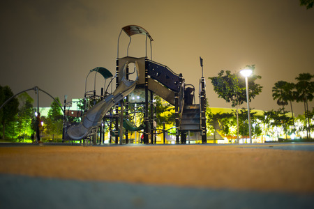 Photography on theme empty playground with metal slide for kids on background natural nature, photo