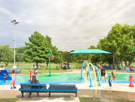 Multicultural kids and parent playing at splash park under summer stormy weather