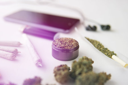 Loose medical marijuana with metal grinder and cleaning tool on ultraviolet surface
