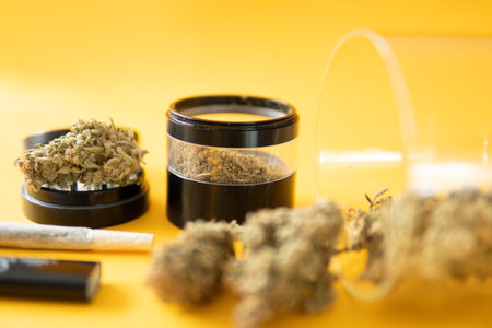 Cannabis nature bud. Marijuana weed bud and grinder. Joint weed. Indica medical health. Yellow background. The pot leaves on buds. Sativa THC CBD.