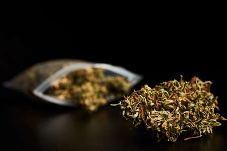 CBD and THC on buds in cannabis. Cannabis buds on black wood