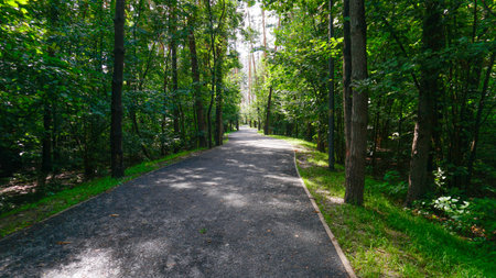 park outdoor walking environment space asphalt route surrounded by vivid green trees foliage in peaceful atmosphere without people here