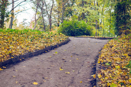 Autumn road with trees and fallen leaves in the forest, close up